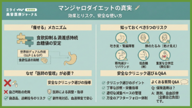 【免責事項】本記事は一般的な情報提供を目的としており、特定の治療法を推奨するものではありません。マンジャロの使用には医師の診断が必須です。また、自由診療の場合、費用やリスクについて十分に納得した上で受診してください。